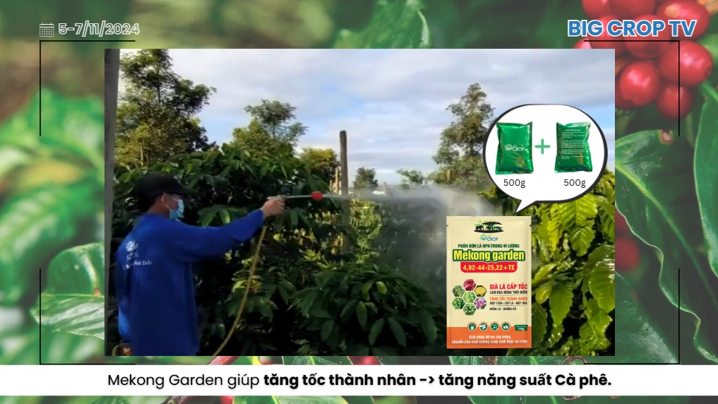 - Bón đơn: 1 kg Mekong Garden + 200 lít nước à phun 1000 lít/ha Cà phê.